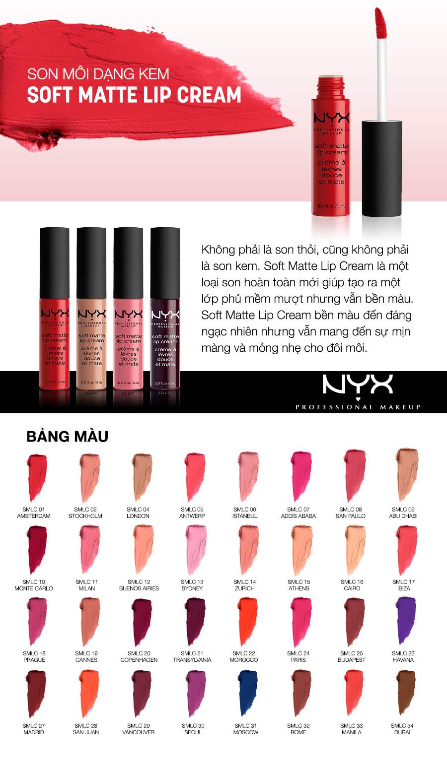 Son kem NYX Professional Makeup Soft Matte Lip Cream là dòng son kem rất được ưa chuộng của NYX Professional Makeup vì chất son kem lì thơm, khả năng giữ màu lâu trôi và luôn giúp đôi môi mềm mại tự nhiên. Với son kem NYX Professional Makeup Soft matte lipcream giúp đôi môi bạn mềm mại, căng mượt và thu hút với màu sắc thời thượng.