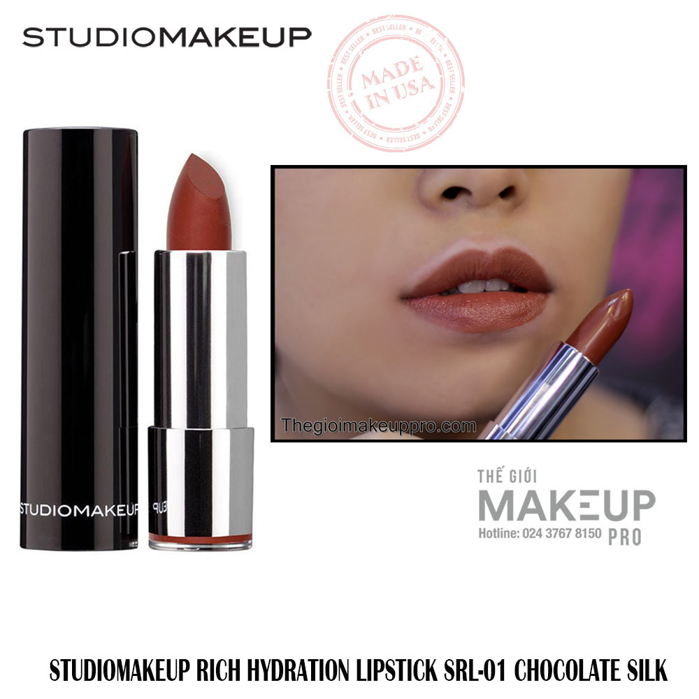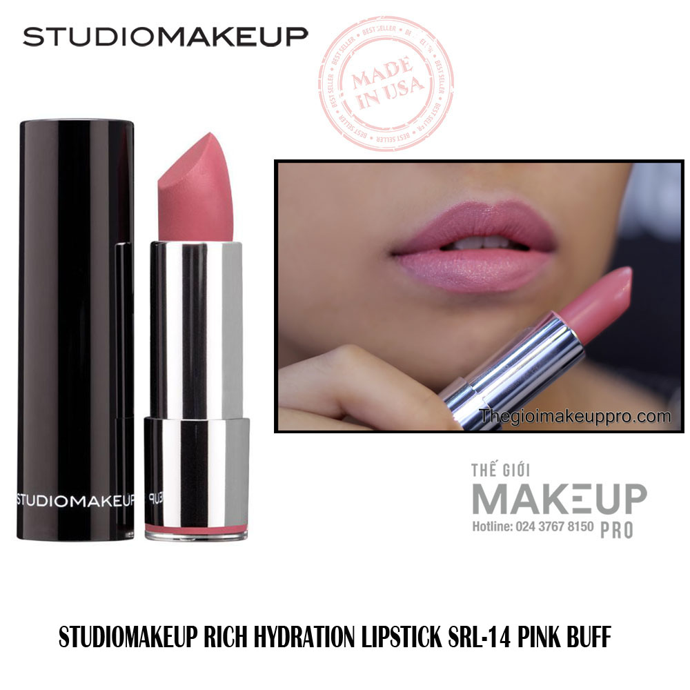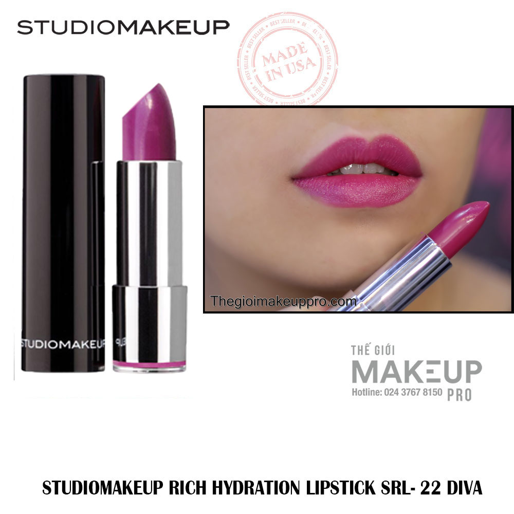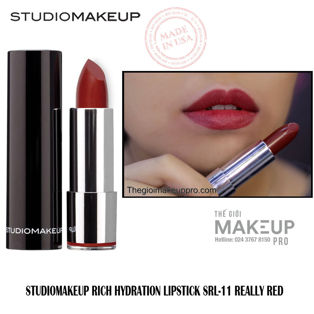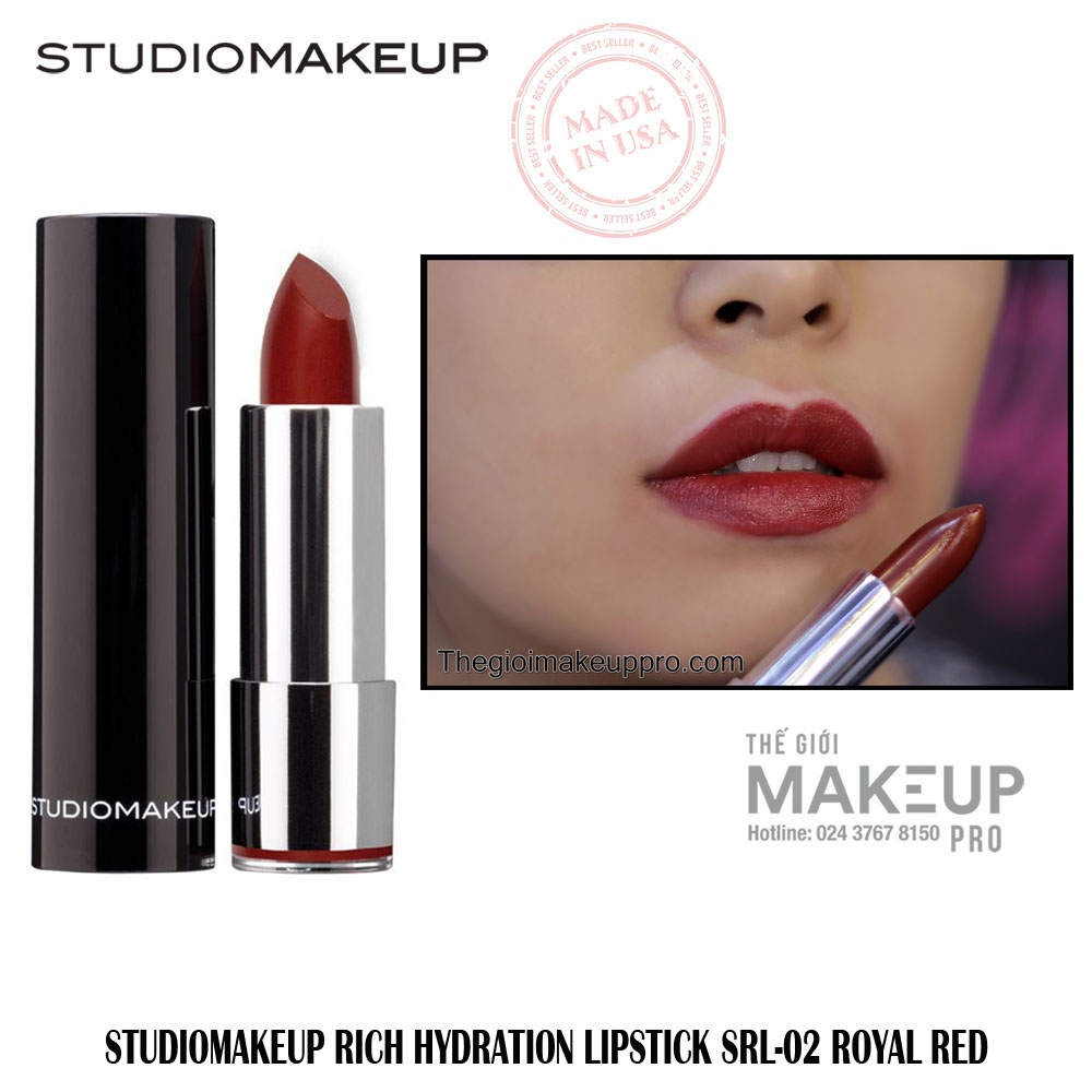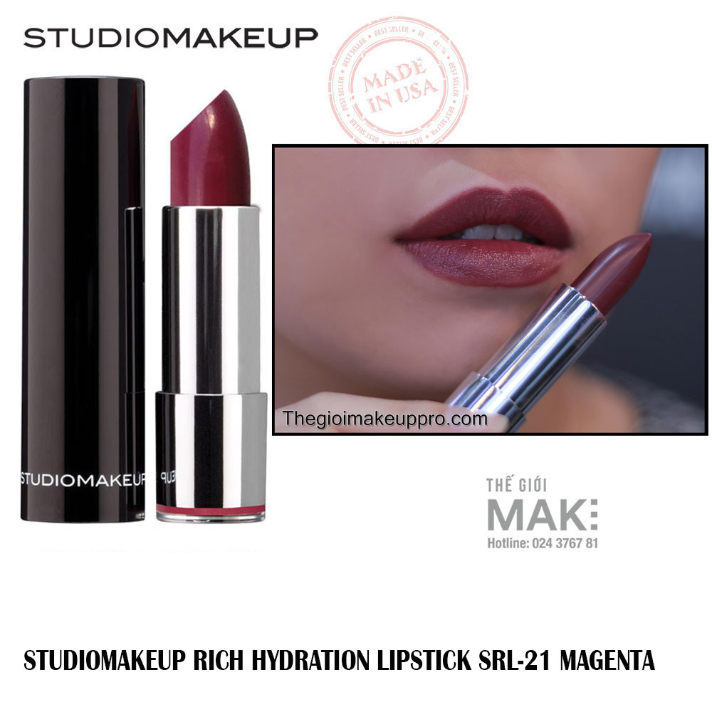 - Son thỏi STUDIOMAKEUP RICH HYDRATION LIPSTICK SRL là dòng son chứa nhiều dưỡng chất bổ sung độ ẩm cho môi, bên cạnh lớp son mịn, son giúp môi mềm và lên chuẩn màu, vẫn giữ được ưu điểm khả năng bám và giữ màu cao suốt nhiều giờ.