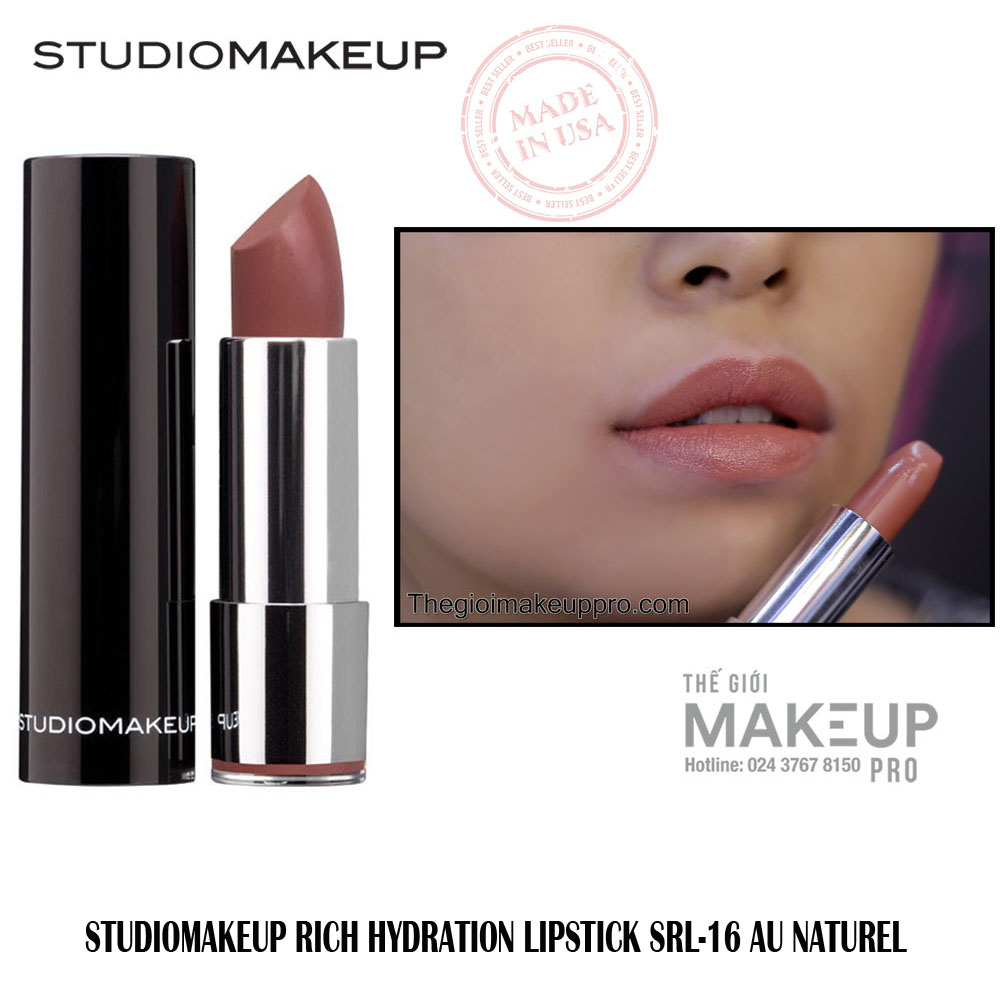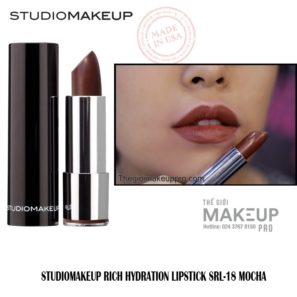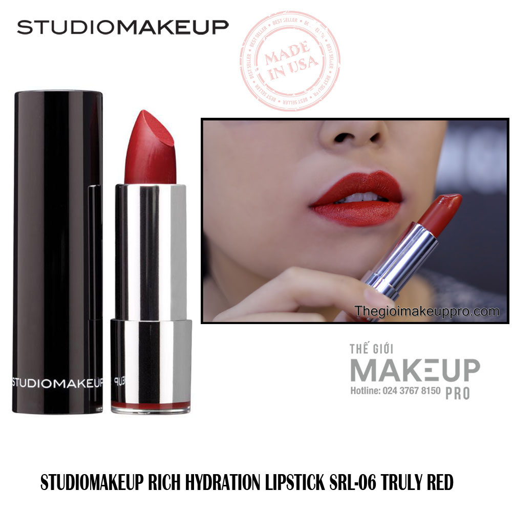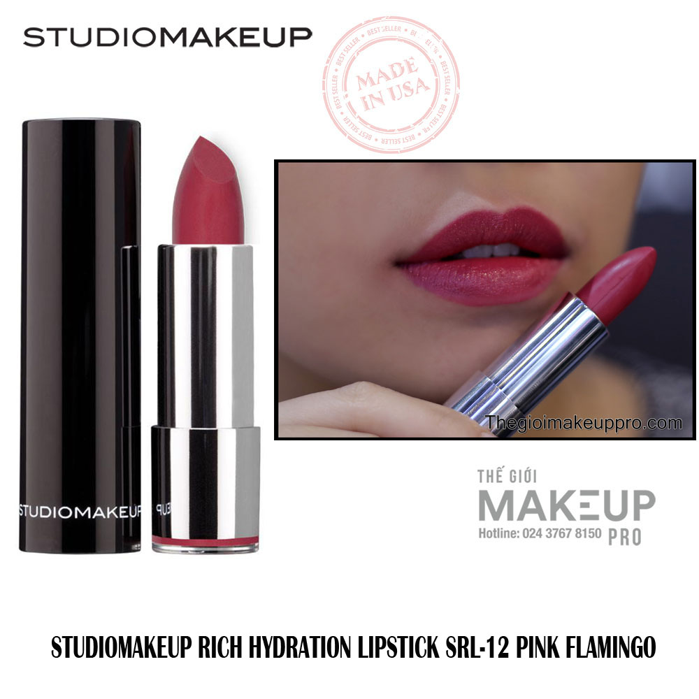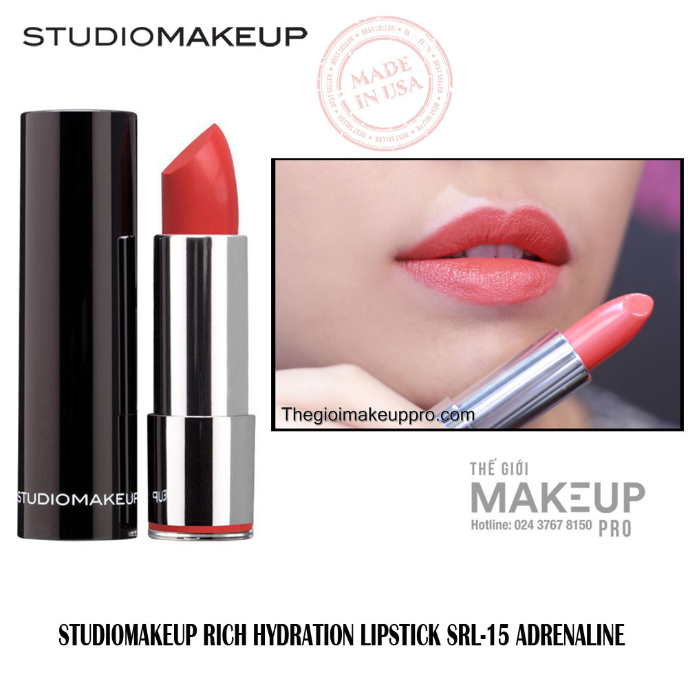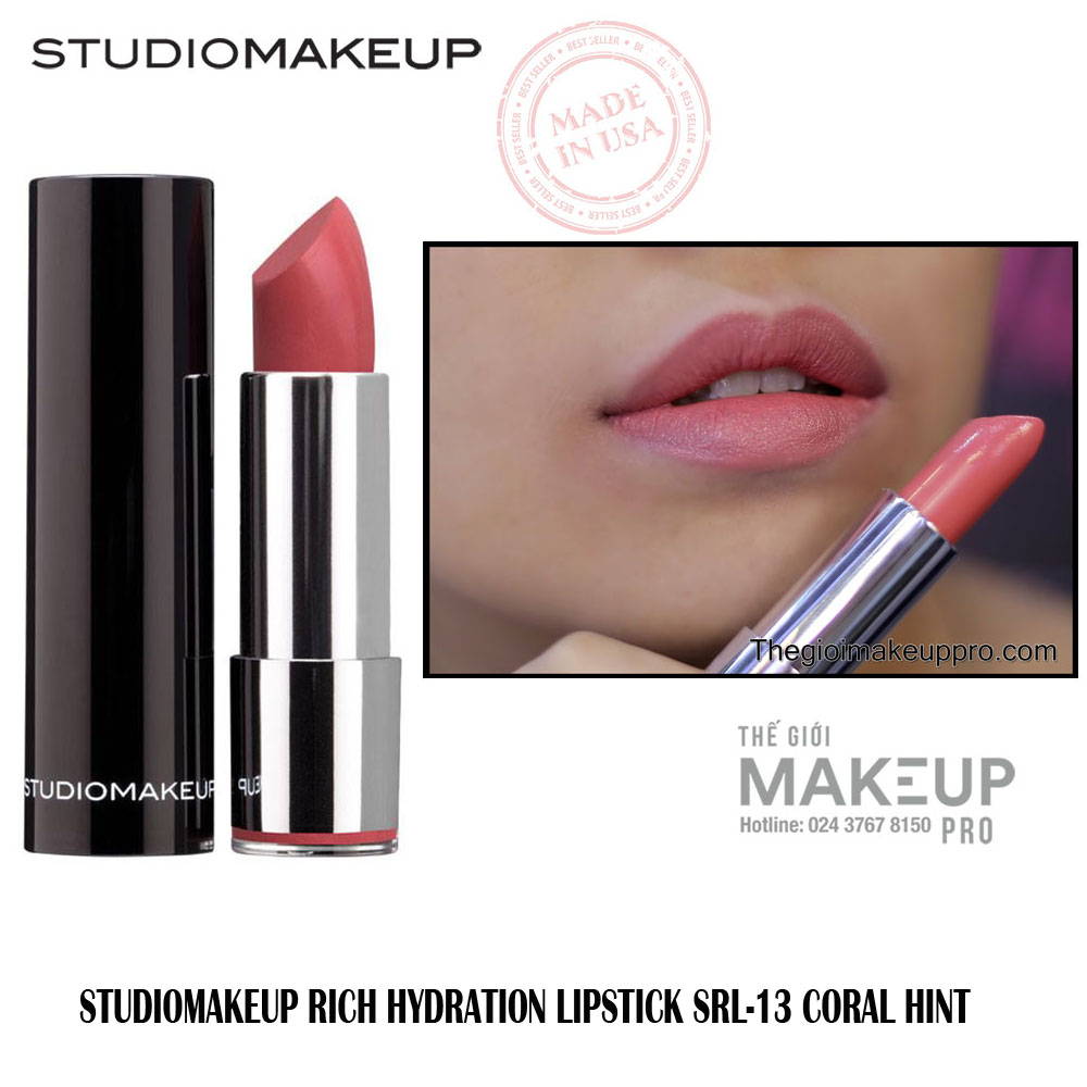 - Son thỏi STUDIOMAKEUP RICH HYDRATION LIPSTICK SRL là dòng son chứa nhiều dưỡng chất bổ sung độ ẩm cho môi, bên cạnh lớp son mịn, son giúp môi mềm và lên chuẩn màu, vẫn giữ được ưu điểm khả năng bám và giữ màu cao suốt nhiều giờ.